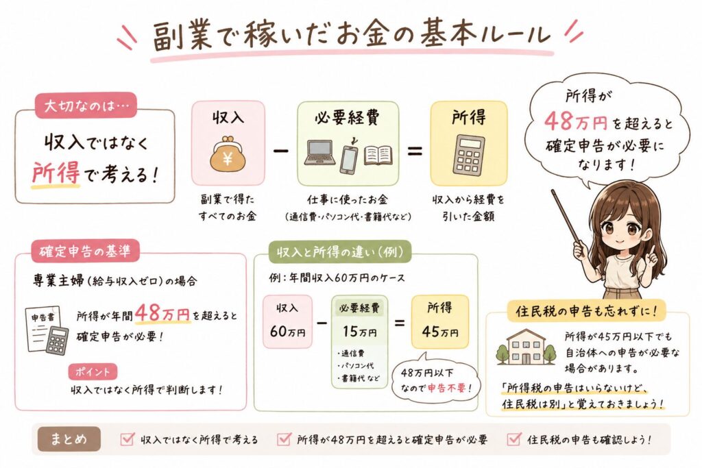 専業主婦(給与収入がゼロの方)の場合、副業の所得が年間48万円を超えると確定申告が必要です。